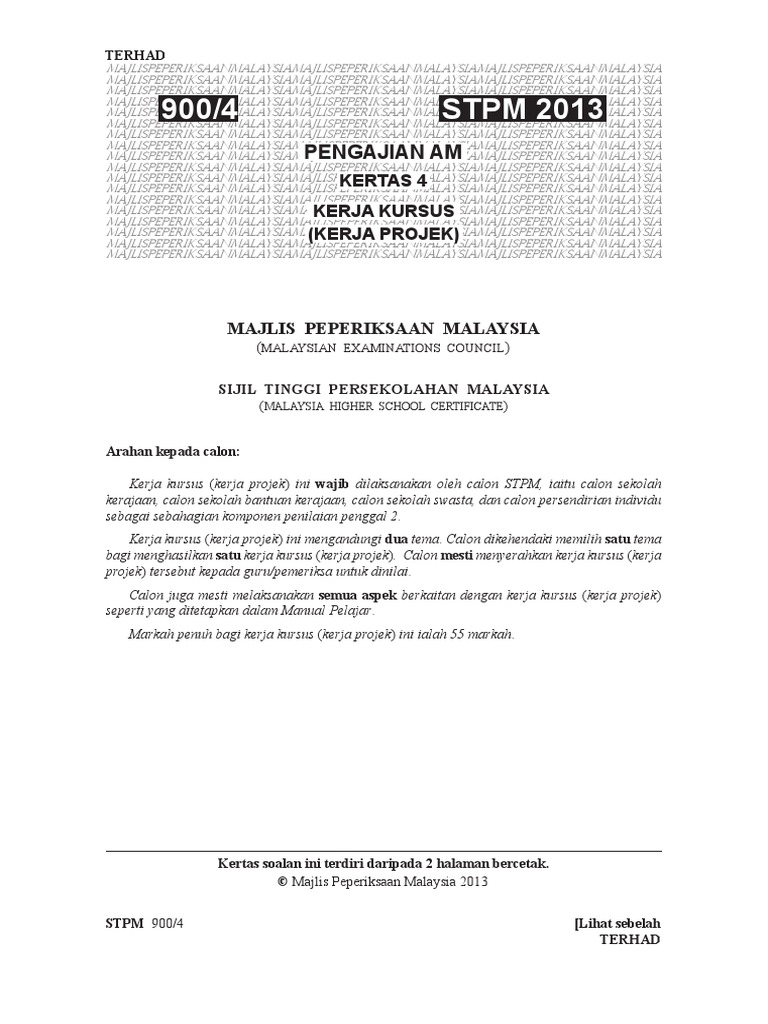 45 1.11 lampiran borang soal selidik kerja kursus pengajian am kertas 4 (900/4). Kerja kursus ini amat penting untuk mendapatkan keputusan yang cemerlang dalam peperiksaan sijil tinggi persekolahan malaysia (stpm). Pdf terhad terhad manual pelaksanaan kerja kursus pengajian am kertas 4 900 4 majlis peperiksaan malaysia muhammad syakir academia edu. Tajuk kerja kursus pengajian am 2020. Pilih satu jawapan dengan menandakan ( / ) dalam.
